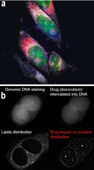 (a) Merged imaging of HeLa cells: Proteins (blue), RNA (red), DNA (green) and Lipids (grey). (b) HeLa imaging after 24 hours of doxorubicin treatment.