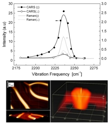 Raman and CARS spectra of of the CN bond of 8CB and 3D CARS imaging of cholesteric finger structure in a chiral nematic mixture (left) and confocal domains in smectic layers (right) of liquid crystal at 2235 cm