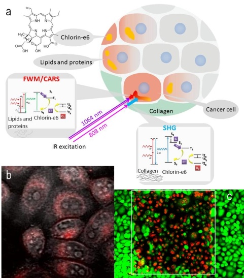 We are also developing new methods of monitoring the intracellular distribution of nanoparticles with high non-linearity based on SHG and SFG for further application of converted light in therapeutic applications.Natural intracellular molecules such as proteins, nucleic acids, lipids and even water, which demonstrate optical non-linear properties, can also be successfully employed for optical upconversion and then trigger photoactivation of different processes. We utilized thisphenomenon for novel nonlinear Photodynamic therapy (PDT) concept. A major limitation of traditional PDT is insufficient penetration of visible (used for PDT drug excitation)light through the tissue, which makes treatment of large or distant tumors not effective. At the same time near-infrared (NIR) light can easily penetrate into the tissue and being up-converted in-situ by natural cellular biomolecules in visible and UV through the CARS/FWM and SHG/SFG processes, can be successively used for photoactivation of most established PDT drugs.