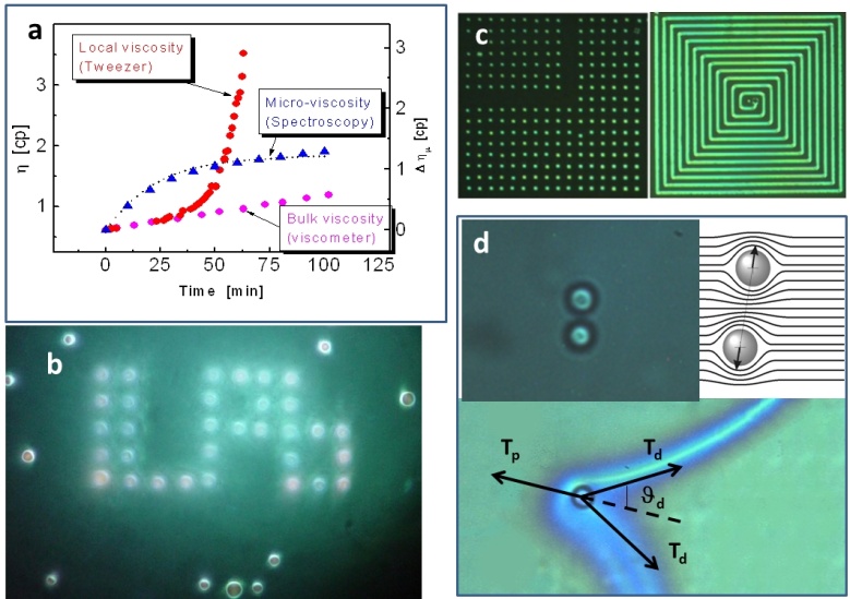 Application of Laser Tweezers for sol-gel micro-viscosity monitoring (a), for fast scanning single laser beam multi-trap beads manipulation (b) dynamically reconfigurable photonic structures (c) and colloidal interaction forces measurements in LC (d).